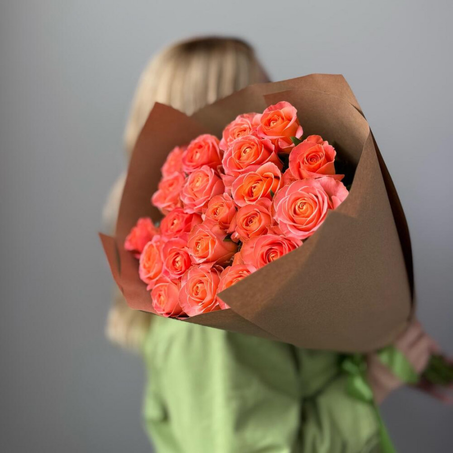 На фото букет из 21 оранжевой розы. В составе: роза 21 шт, крафт-бумага 2 шт, атласная лента 1 шт, . Все цветы свежие и ароматные, букет красиво оформлен и отлично подходит для подарка. Доступна доставка цветов или самовывоз.