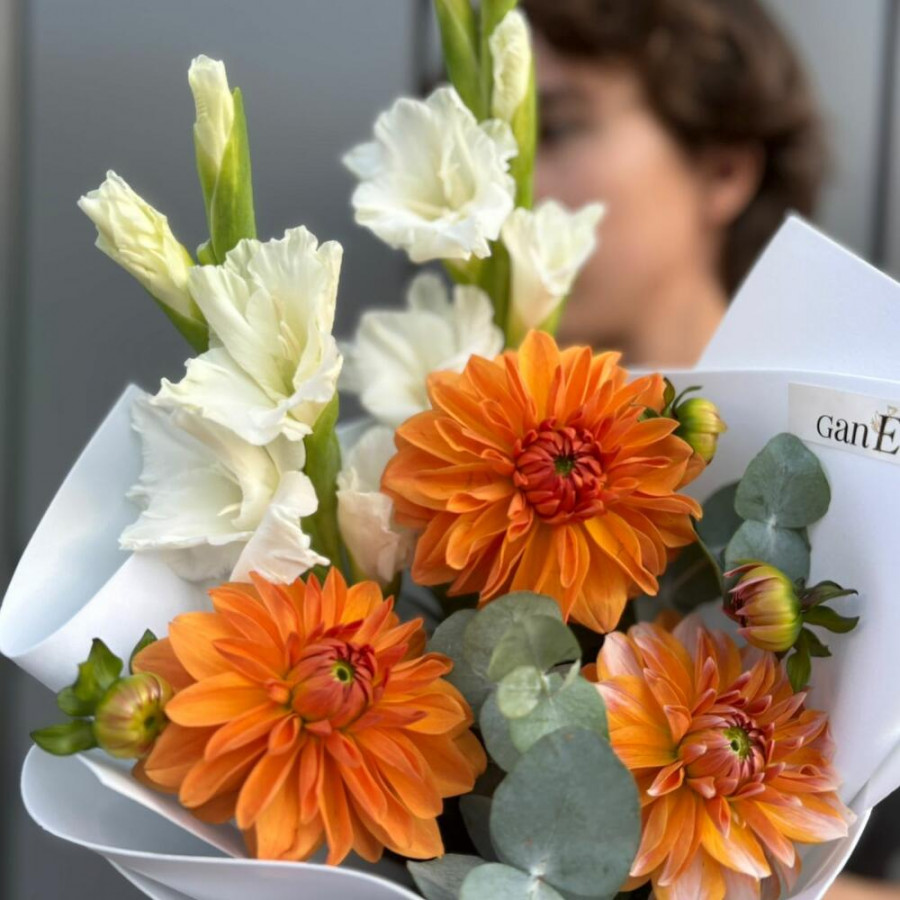 На фото букет с георгинами и гладиолусами. В составе: георгина 3 шт, гладиолус 2 шт, эвкалипт 2 шт, дизайнерская упаковка 1 шт, атласная лента 1 шт, . Все цветы свежие и ароматные, букет красиво оформлен и отлично подходит для подарка. Доступна доставка цветов или самовывоз.